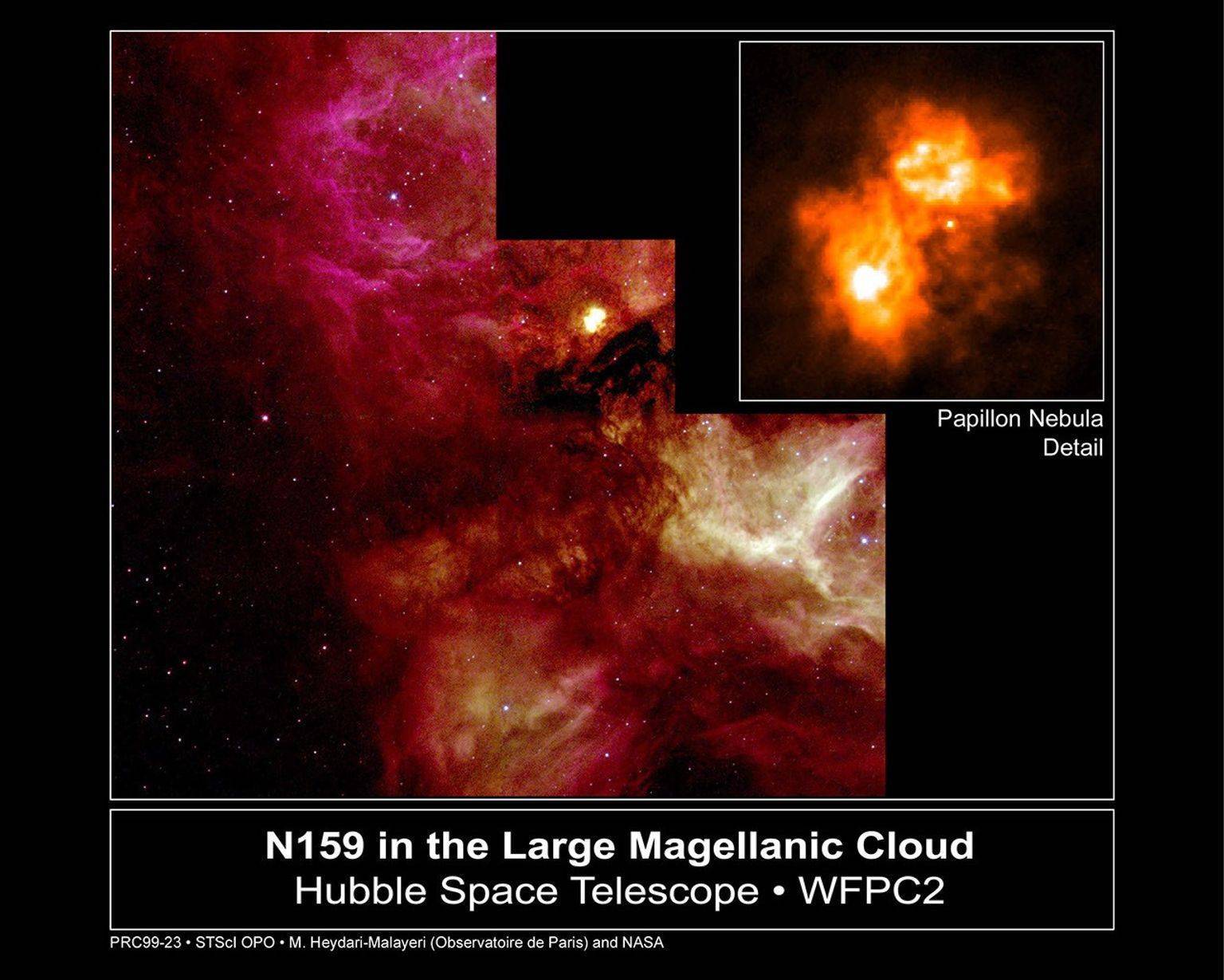 N159 恒星形成区也叫巴比龙星云(Papillon Nebula),在法语中的意思是蝴蝶,因此在天文圈内也称为“太空蝴蝶”。