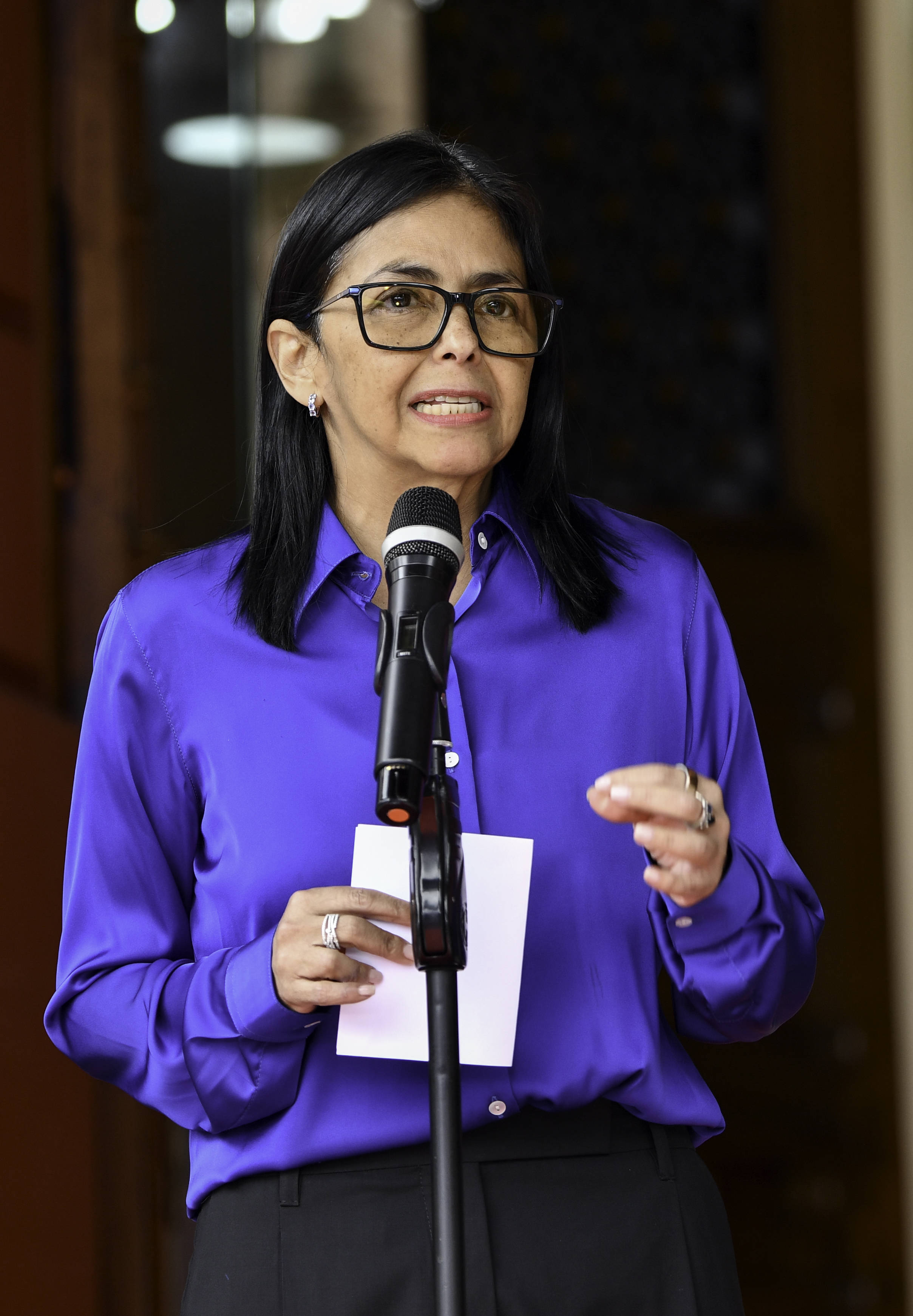 1月14日,在委内瑞拉首都加拉加斯的总统府观花宫,委内瑞拉代总统德尔西·罗德里格斯参加新闻发布会。新华社记者 丁洪法摄