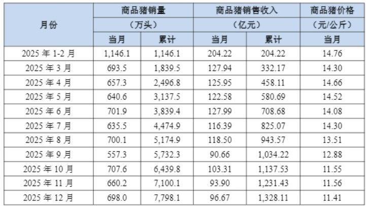 简报显示,2025年12月份,牧原股份销售商品猪698.0万头,同比变动-14.75%,其中向全资子公司牧原肉食品有限公司及其子公司合计销售商品猪339.0万头;商品猪销售收入96.67亿元,同比变动-36.06%。商品猪销售均价11.41元/公斤,同比变动-25.38%。