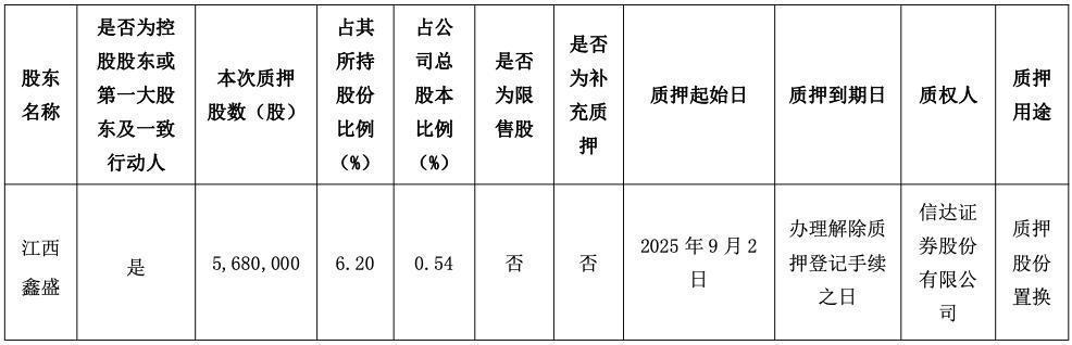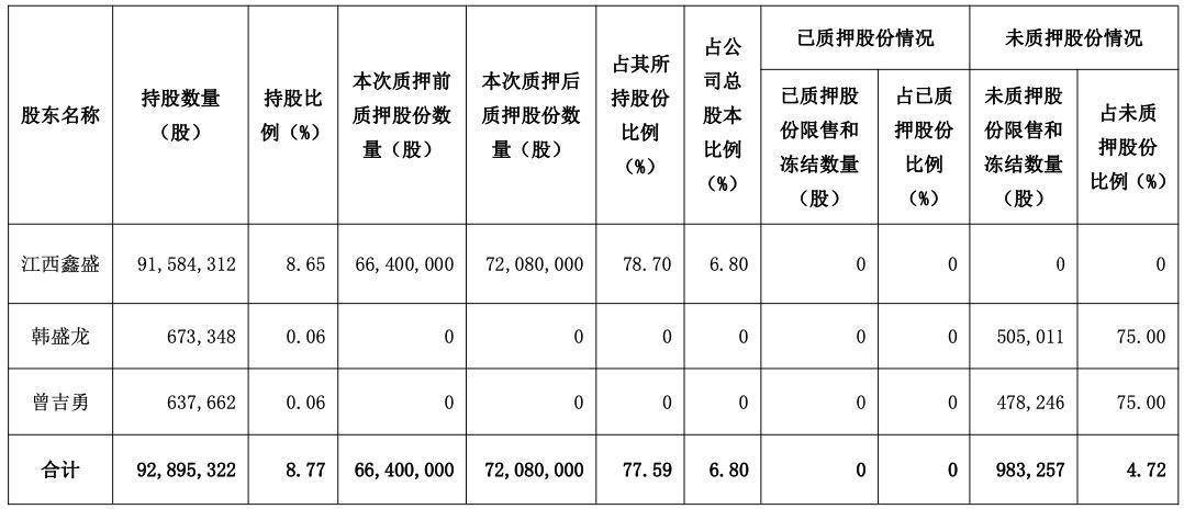 公告显示,江西鑫盛本次股份质押融资用于质押股份置换,不存在负担重大资产重组等业绩补偿。截至公告披露日,上述股东与一致行动人所持质押股份情况如下: