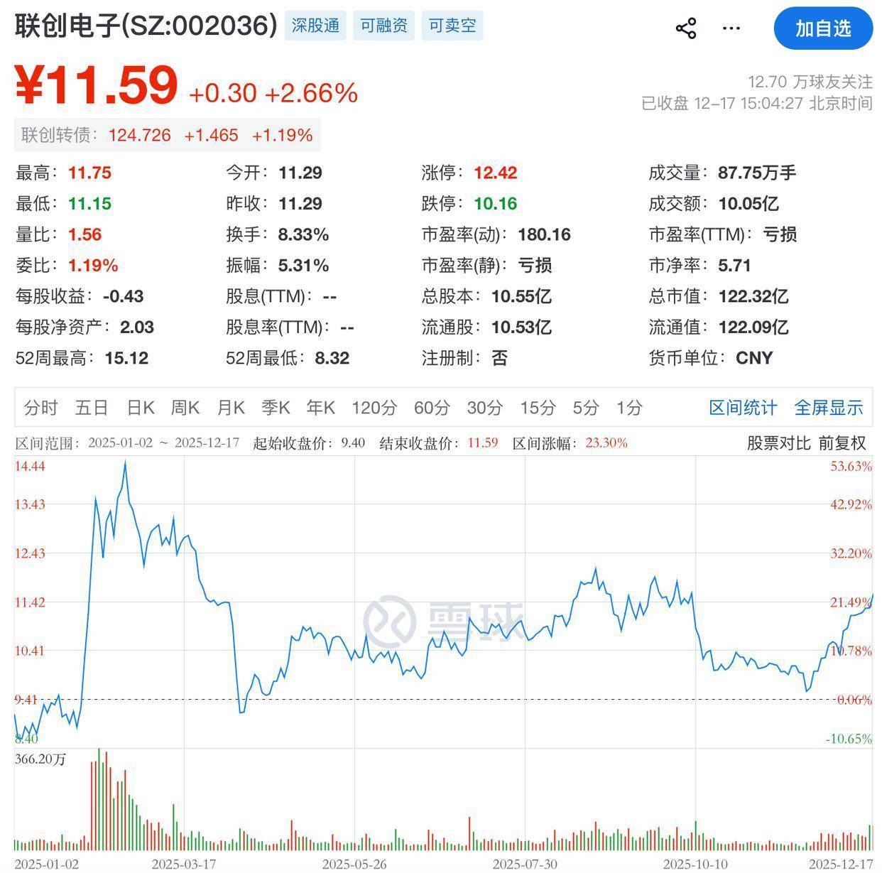 二级市场上,截至12月17日收盘,联创电子上涨2.66%报11.59元/股,总市值约122.32亿元。今年以来,公司股价已上涨23.30%。