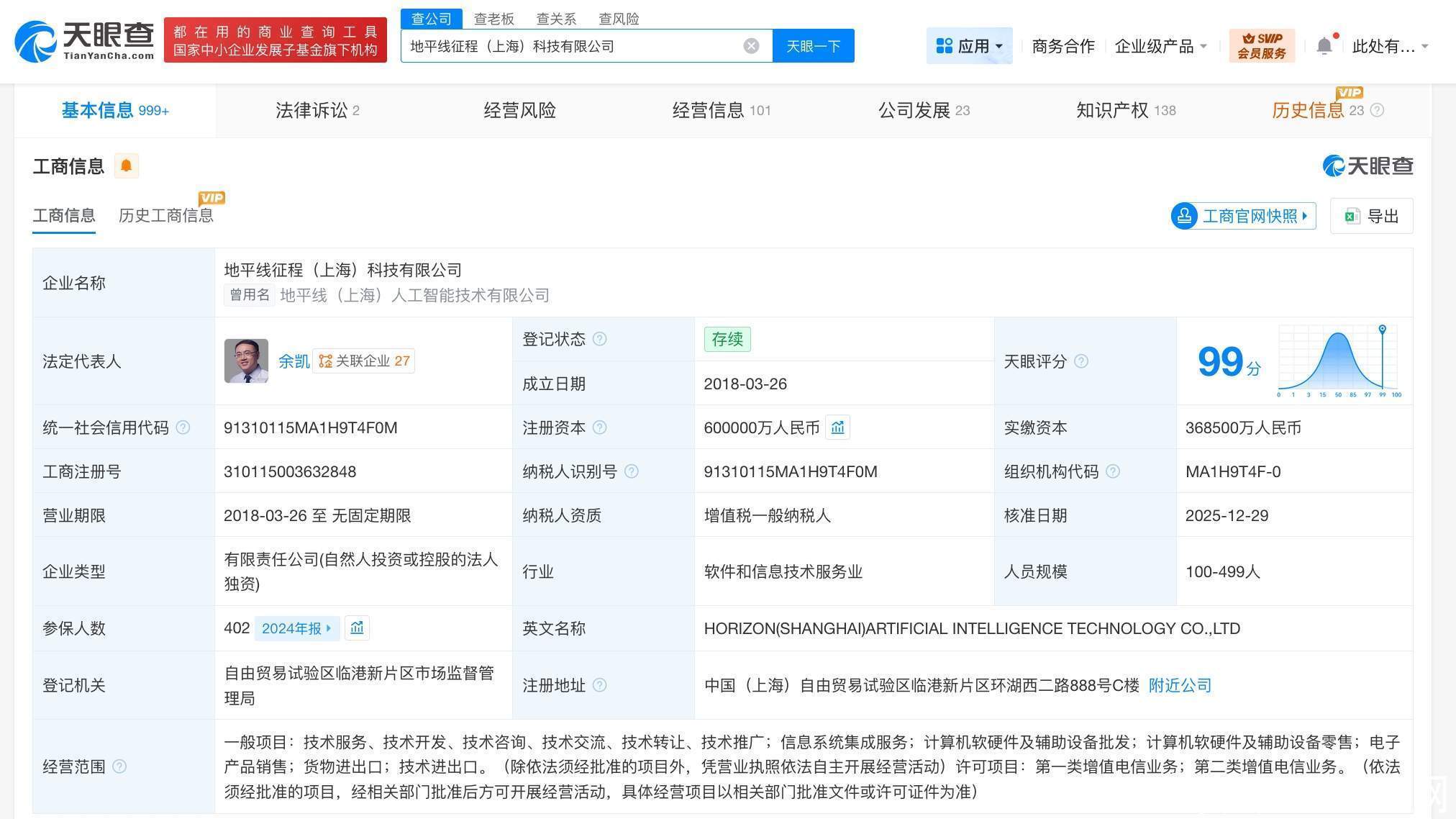 该公司成立于2018年3月,法定代表人为余凯,经营范围含信息系统集成服务、计算机软硬件及辅助设备批发、计算机软硬件及辅助设备零售、电子产品销售、货物进出口、技术进出口等。股东信息显示,该公司由北京地平线机器人技术研发有限公司全资持股。